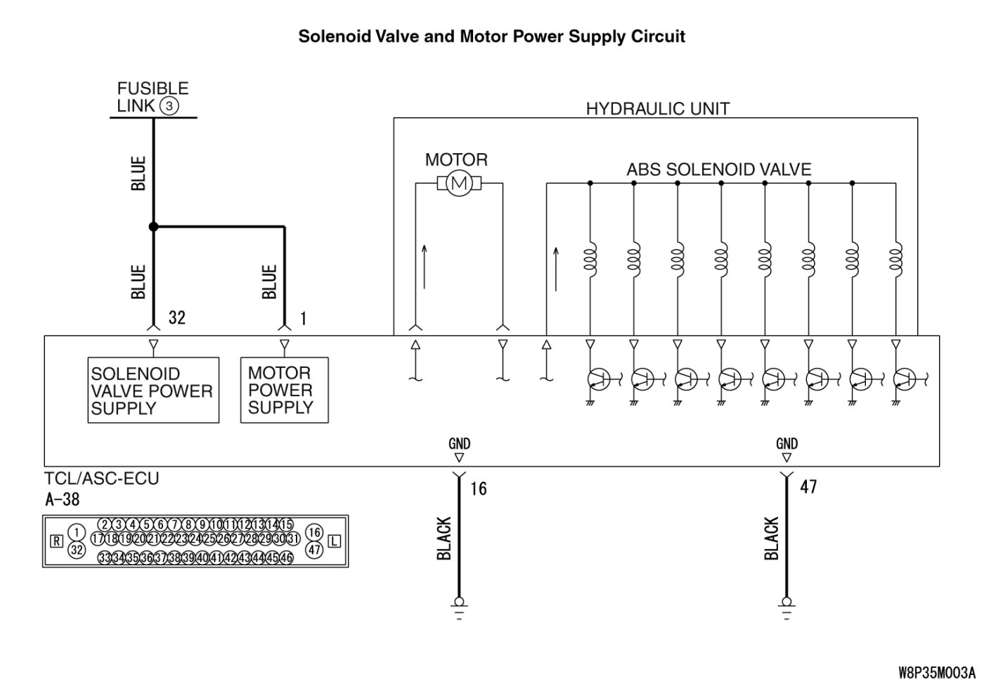 Repair the wiring harness between TCL/ASC-ECU connector A-38 terminal 32 and fusible link No.3. Then go to Step 10.