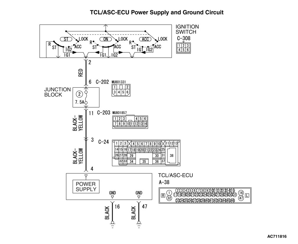 The TCL/ASC-ECU is energized by the ignition switch (IG1) through multi-purpose fuse No.2 and the TCL/ASC-ECU terminal 4.