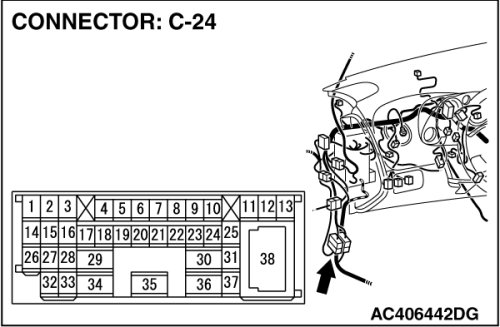 (1)Disconnect the connector A-38, and connect special tool MB991997 to the wiring harness-side connector.