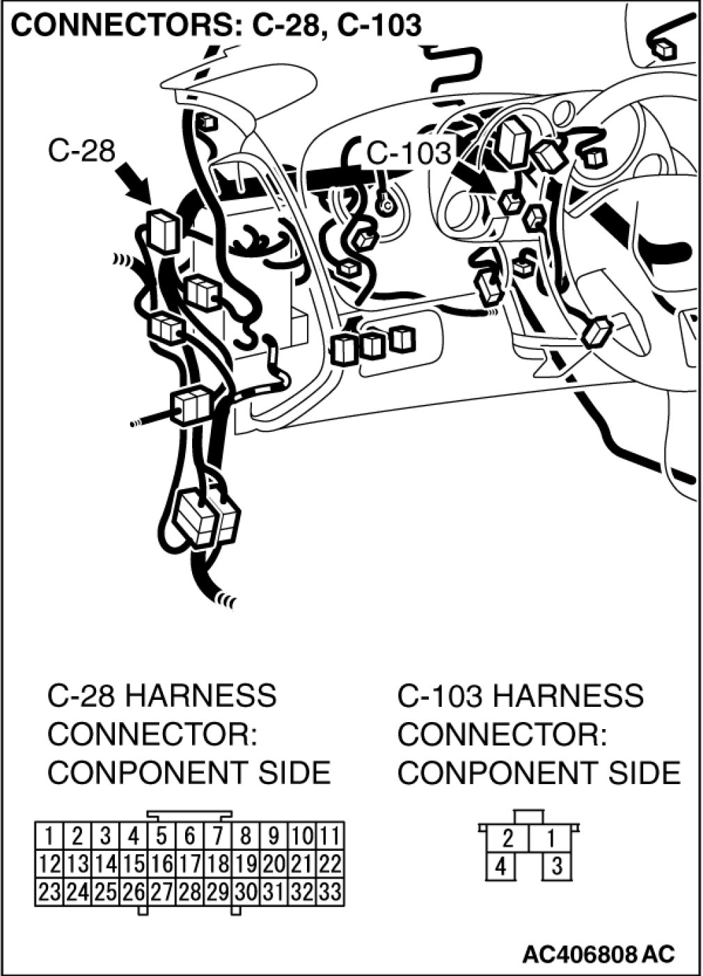 STEP 11. Check stoplight switch connector C-103 and joint connector (1) C-28 for loose, corroded or damaged terminals, or terminals pushed back in the connector.