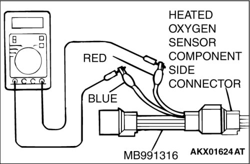 (2)Measure the resistance between heated oxygen sensor connector terminal No. 1 (red clip) and terminal No. 3 (blue clip).