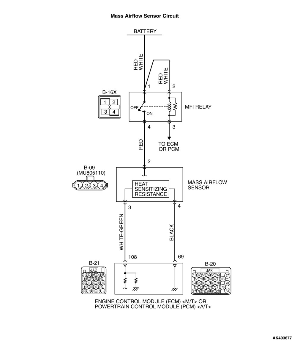 - The mass airflow sensor power is supplied from the MFI relay (terminal No. 4), and the ground is provided on the ECM [M/T] or the PCM [A/T] (terminal No. 69).
