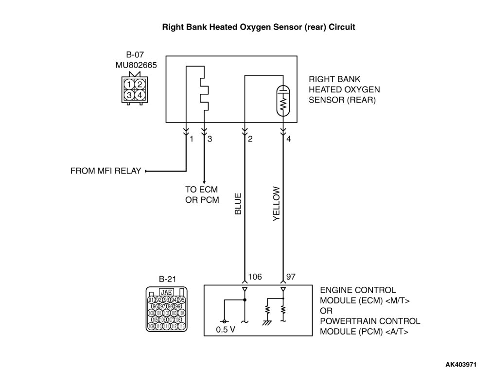 - The ECM [M/T] or the PCM [A/T] applies an offset voltage of 0.5 volt to terminal No. 2 of the right bank oxygen sensor (rear).