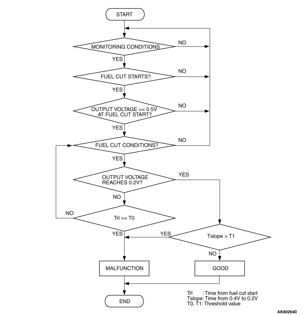 - The left bank heated oxygen sensor (rear) output voltage does not reach 0.2 volt for 6 seconds from fuel cut start.