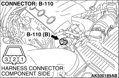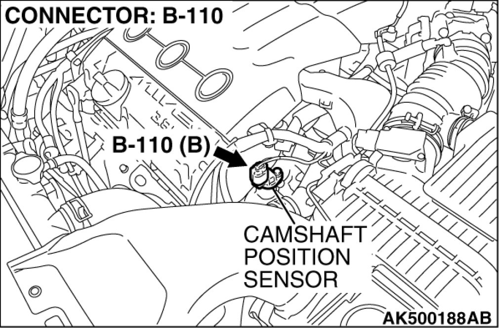 (1)Disconnect the camshaft position sensor connector B-110, and connect test harness special tool (MB991709) between the separated connectors (All terminals should be connected).