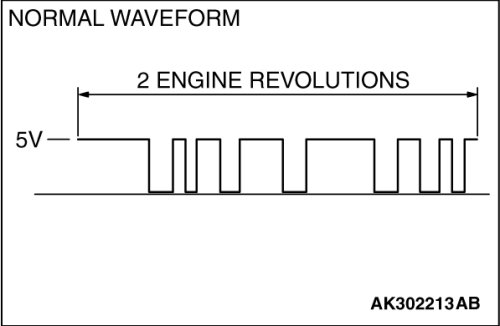 When measuring with the ECM [M/T] or the PCM [A/T] side connector, disconnect all ECM [M/T] connectors or PCM [A/T] connectors. Connect the check harness special tool (MB991923) between the separated connectors. then connector the oscilloscope probe to the check harness connector terminal No. 104.