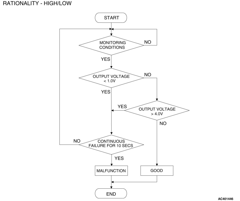 - The ECM [M/T] or PCM [A/T] determines whether the fuel tank differential pressure sensor signal voltage is within normal operating parameters.