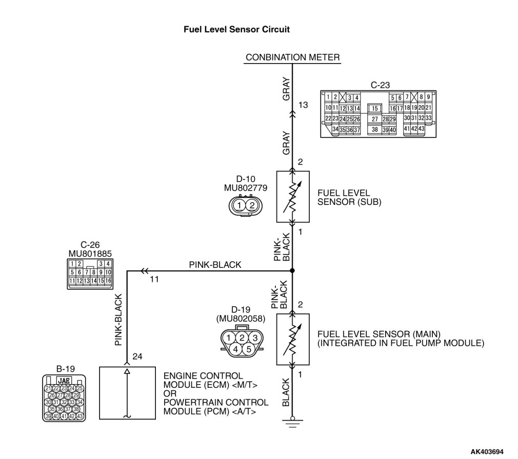 - The ECM [M/T] or the PCM [A/T] detects the amount of fuel left in the fuel tank with this signal, and also controls the fuel level warning light.