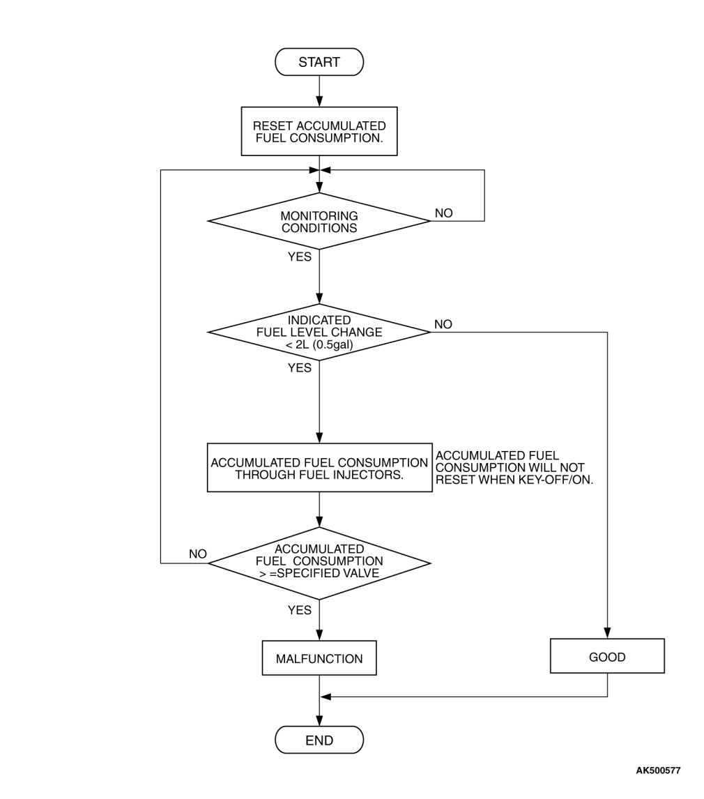 - When the fuel consumption calculated from the operation time of the injector amounts to 30 liters (7.8 gal), the diversity of the amount of fuel in tank calculated from the fuel level sensor is 2 liters (0.5 gal) or less.