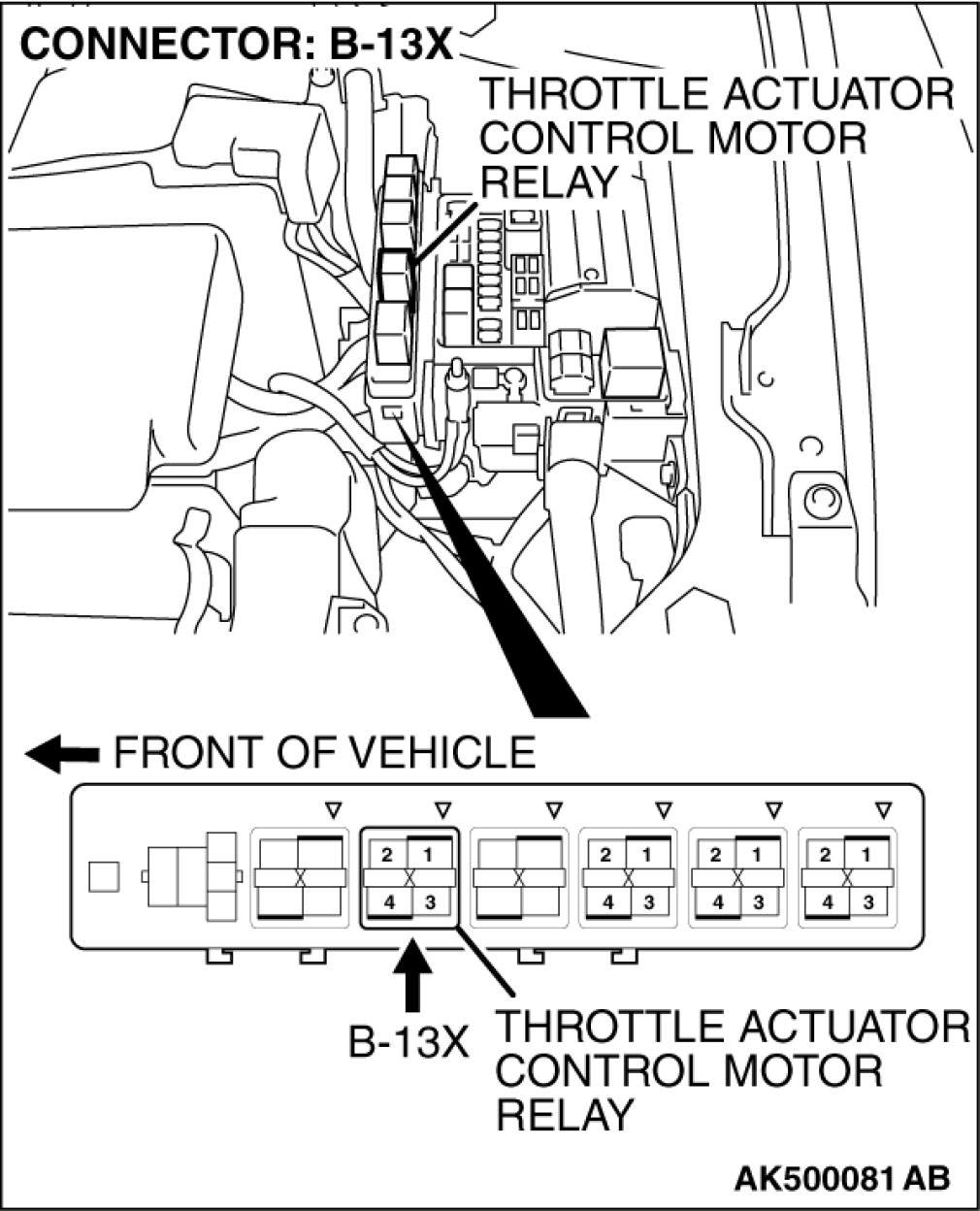 STEP 1. Check harness connector B-13X at throttle actuator control motor relay for damage.