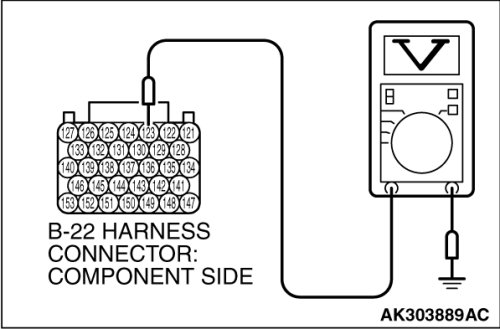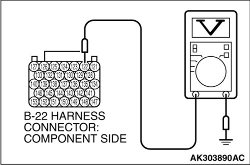 STEP 7. Measure the power supply voltage at ECM [M/T] or PCM [A/T] harness side connector B-22.