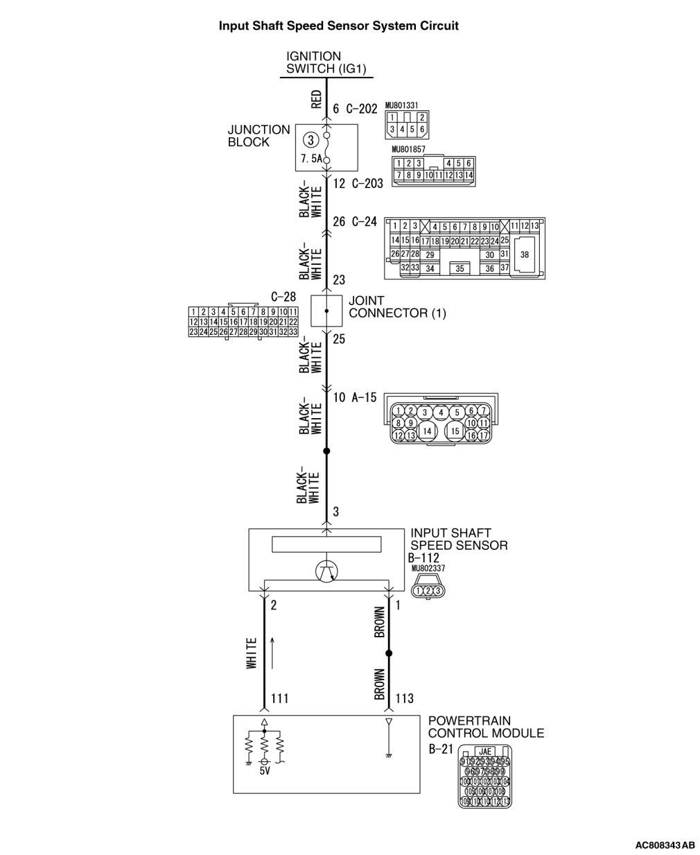 - The input shaft speed sensor is connected to the PCM (terminals 111 and 113) via the input shaft speed sensor connector (terminals 1 and 2).