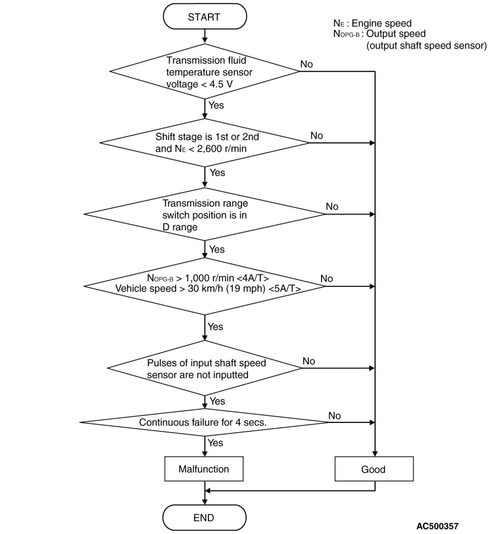 - If there is no detection pulse from input shaft speed sensor (turbine rotation) even during driving test at more than specified speed, PCM judges that input shaft speed sensor has a failure.