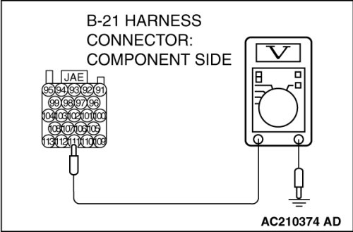STEP 6. Measure the PCM output voltage to the speed sensor at the PCM connector B-21 by using check harness special tool MB991923.