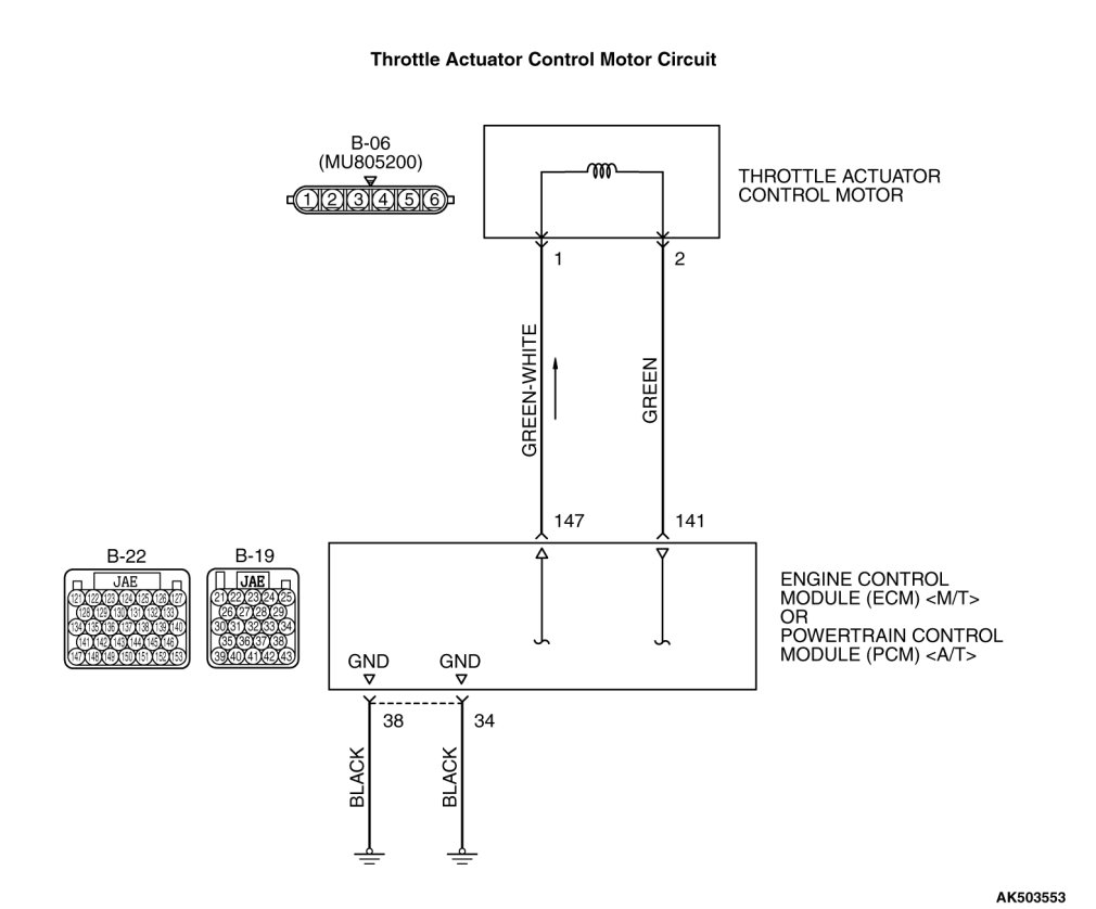 STEP 5. Check for open circuit and harness damage between throttle actuator control motor connector B-06 (terminal No. 1) and ECM [M/T] or PCM [A/T] connector B-22 (terminal No. 147).