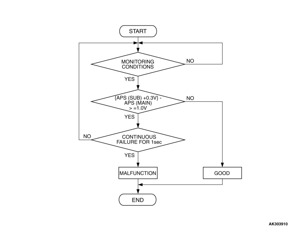 - Voltage obtained with the formula given below is 1.0 volt or higher for 0.2 second: accelerator pedal position sensor (main) output voltage - [accelerator pedal position sensor (sub) output voltage +0.3 volt].