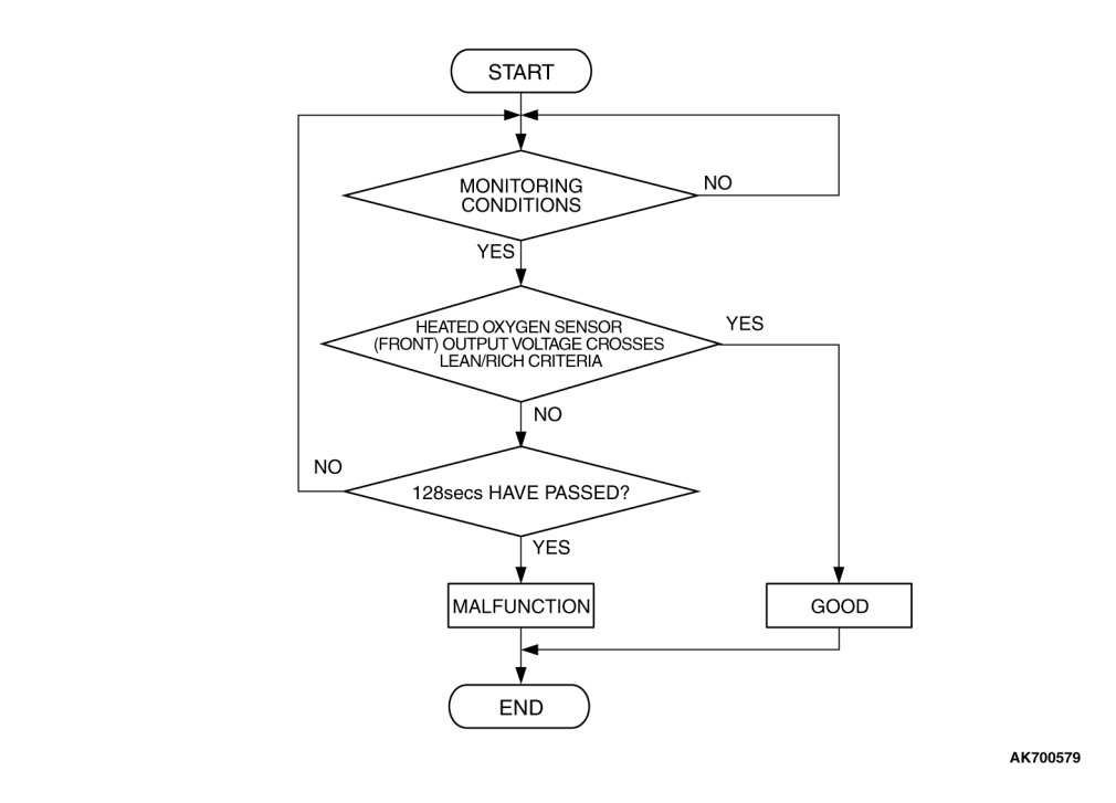 - Left bank heated oxygen sensor (front) output voltage is less than lean/rich criteria (about 0.5 volt) for 128 seconds.
