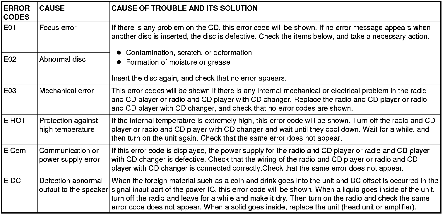 If the radio and CD player or radio and CD player with CD changer detects any malfunction in itself or the inserted CD, the error codes below will be shown on the multi-center display.