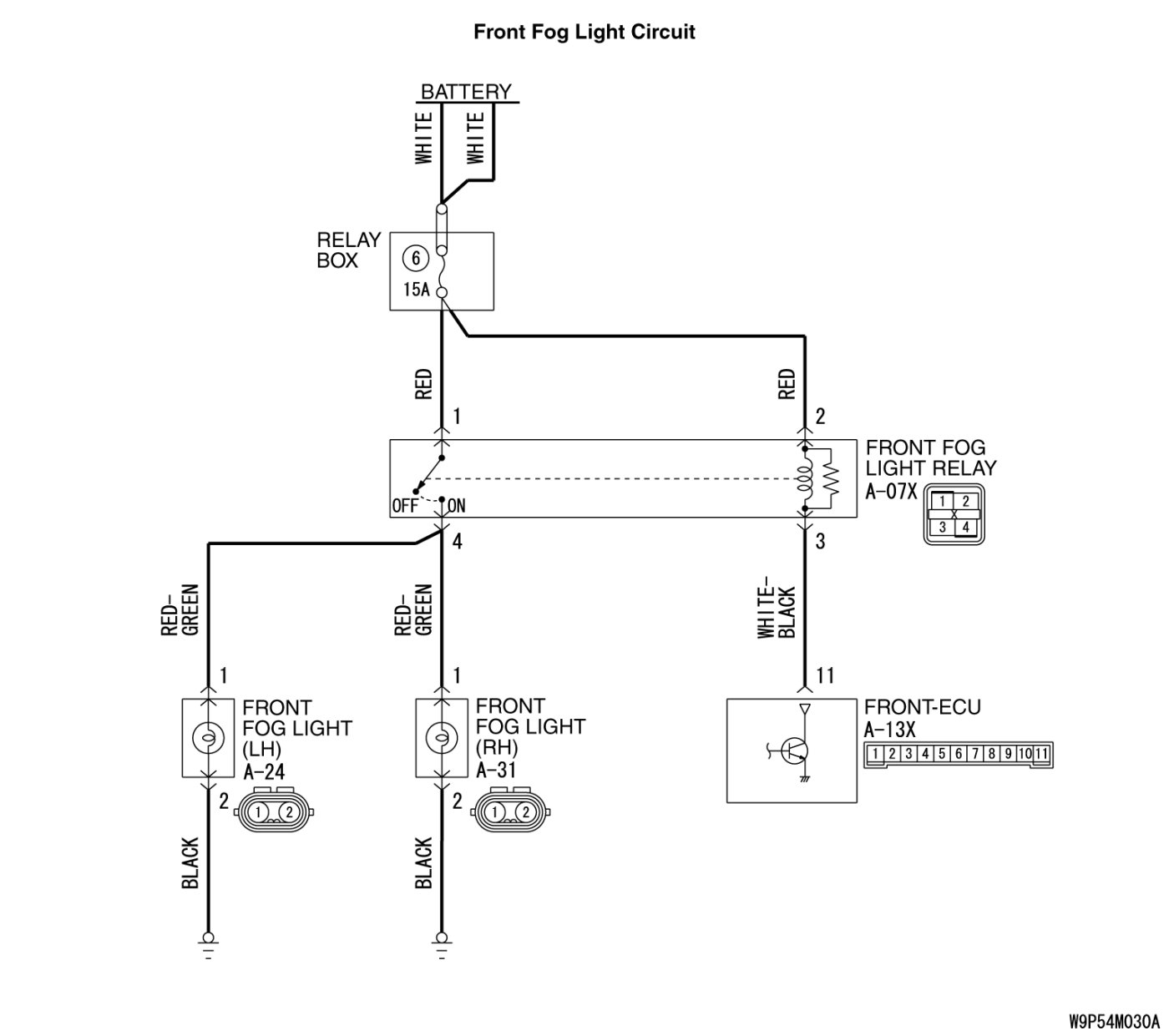 - Then the front-ECU switches on its relay to illuminate the front fog lights.