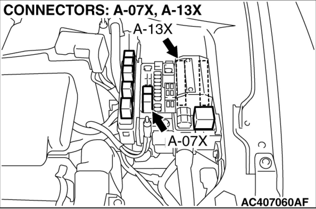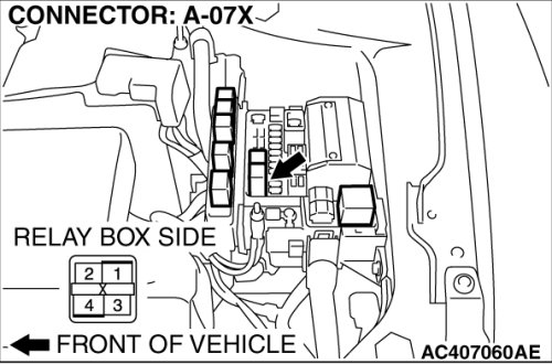 STEP 3. Check front fog light relay connector A-07X for loose, corroded or damaged terminals, or terminals pushed back in the connector.