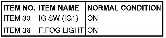 Normal condition is not displayed for "F.FOG LIGHT" : Refer to Inspection Procedure M-3 "ETACS-ECU does not receive any signal from the front fog light switch Inspection Procedure M-3."