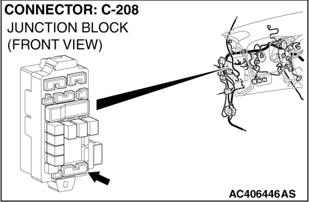 Also check junction block connector C-208 for loose, corroded, or damaged terminals, or terminals pushed back in the connector. If junction block connector C-208 is damaged, repair or replace the damaged component(s) as described in Harness Connector Inspection Harness Connector Inspection.