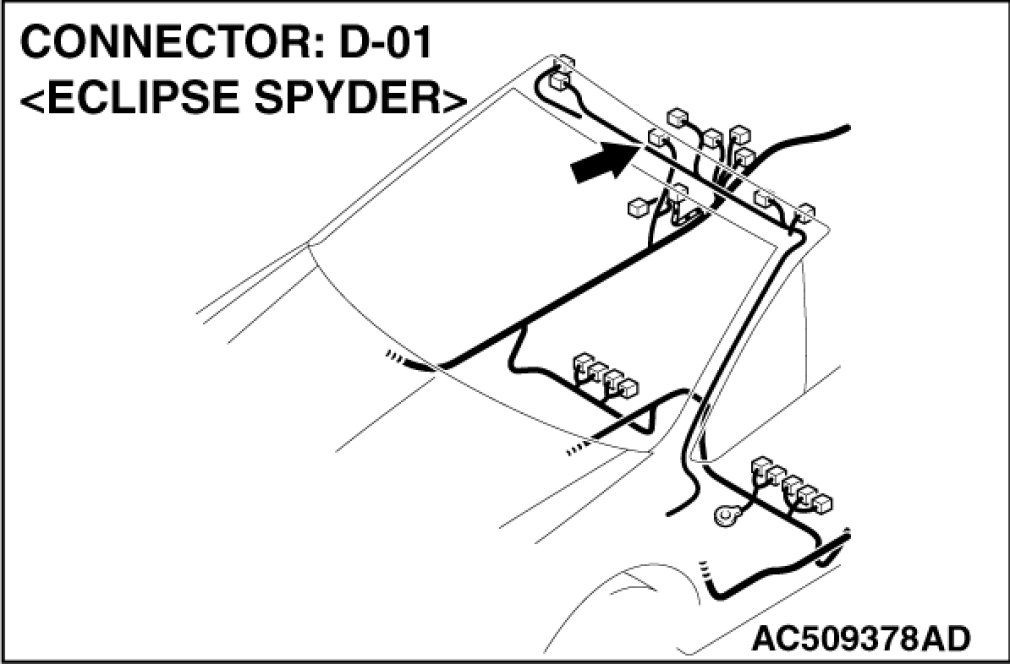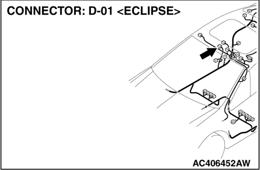 STEP 7. Check door switch (RH) connector D-01 for loose, corroded or damaged terminals, or terminals pushed back in the connector.