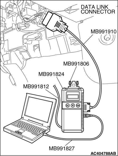 To prevent damage to scan tool MB991958, always turn the ignition switch to the "LOCK" (OFF) position before connecting or disconnecting scan tool MB991958. Connect special tool MB991910 before connecting special tool MB991812. Be sure to connect special tool MB991806 after turning on special tool MB991824.
