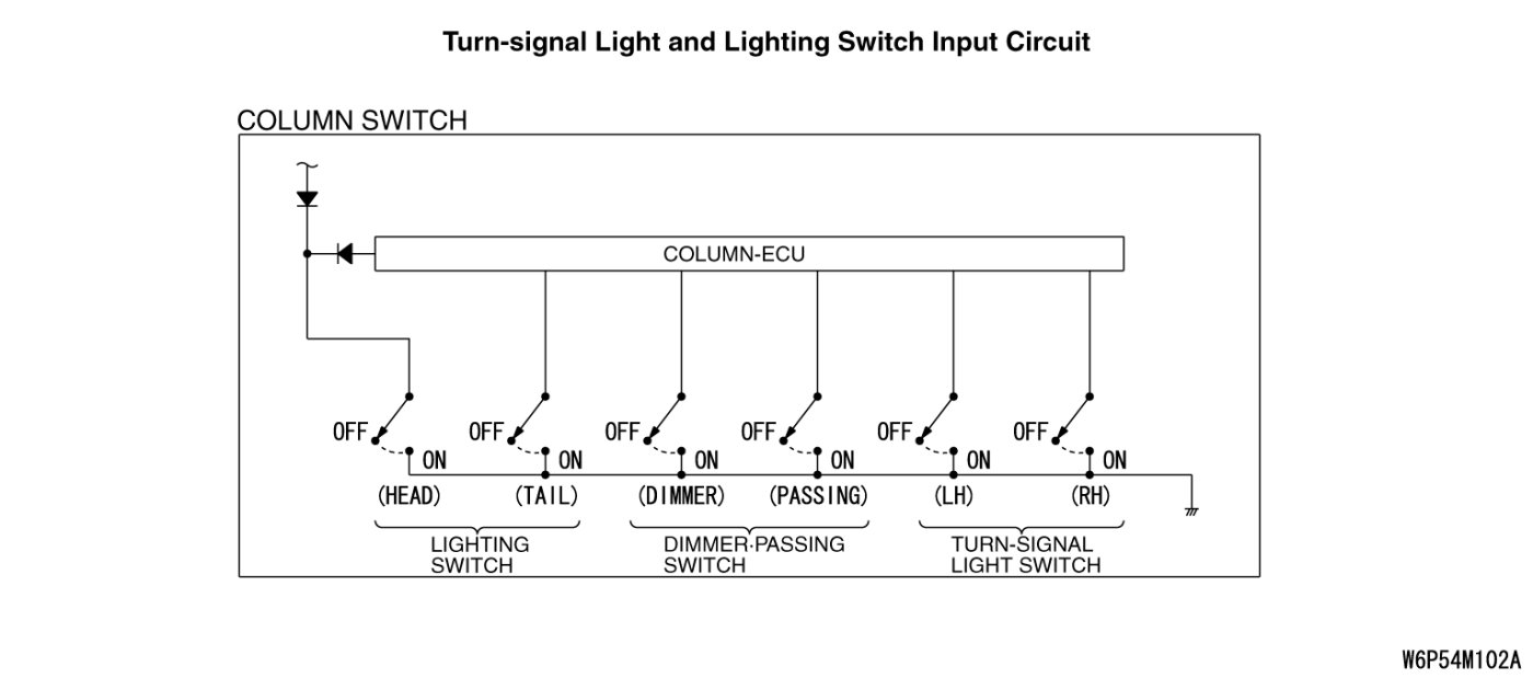 INSPECTION PROCEDURE M-6: Column Switch: ETACS-ECU does not receive any signal from the taillight switch, the headlight switch, the passing light switch, the dimmer switch or the turn-signal light switch.
