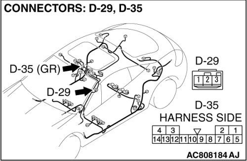 STEP 2. Check sunroof motor assembly connector D-35 and ETACS-ECU connector C-218 for loose, corroded or damaged terminals, or terminals pushed back in the connector.
