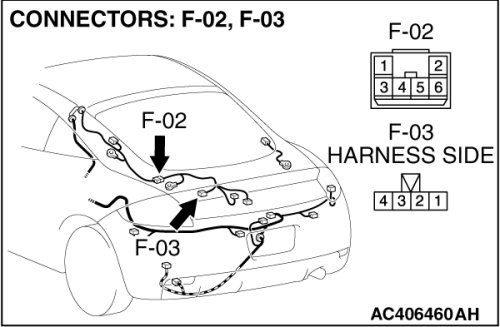 STEP 1. Check rear wiper motor connector F-03 for loose, corroded or damaged terminals, or terminals pushed back in the connector.