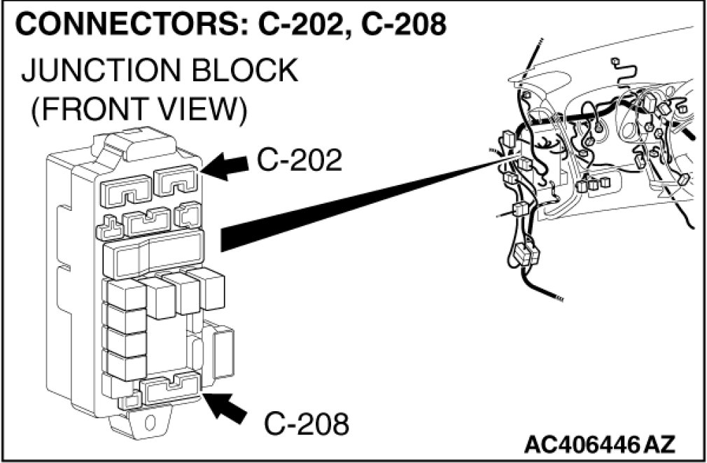 Also check intermediate connector F-02, junction block connectors C-202 and C-208 for loose, corroded, or damaged terminals, or terminals pushed back in the connector. If intermediate connector F-02, junction block connectors C-202 or C-208 are damaged, Repair or replace the damaged component(s) as described in Harness Connector Inspection Harness Connector Inspection.