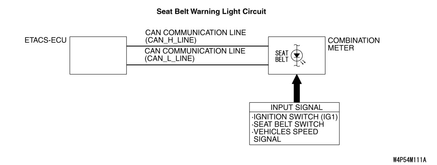 The combination meter and the ETACS-ECU illuminates and flashes the seat belt warning light by using the signal from the seat belt switch, the ignition switch (IG1) and the vehicle speed signal.