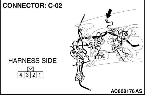 (1)Disconnect security indicator connector C-02 and measure the voltage available at the wiring harness side of the connector.
