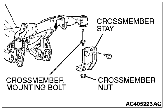 Ensure that the crossmember mounting bolts have been tightened to 110 ± 15 Nm (81 ± 11 ft-lb), and then install the crossmember stay with the crossmember nut.