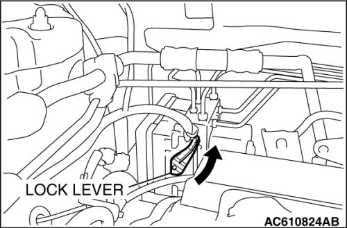 Move the lock lever of the TCL/ASC-ECU connector as shown in the illustration, and then disconnect the harness connector.