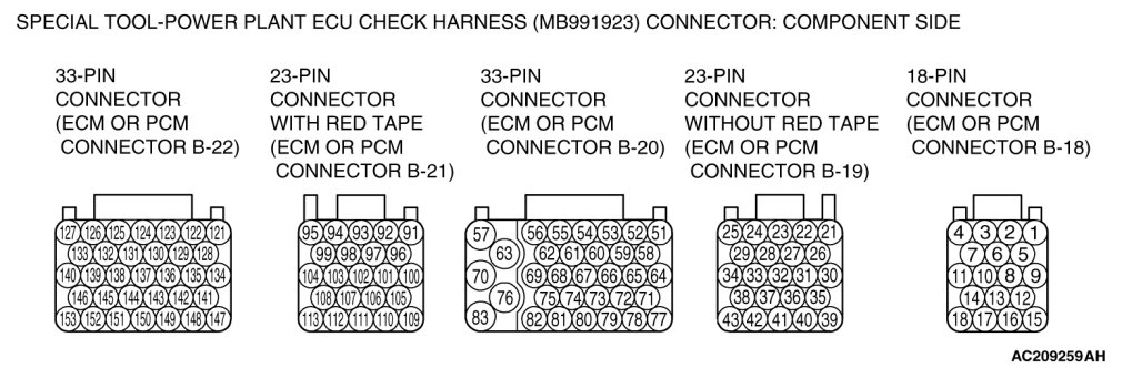 1. Disconnect the ECM [M/T] or PCM [A/T] connectors, and connect special tool MB991923 (Power plant ECU check harness) in between.