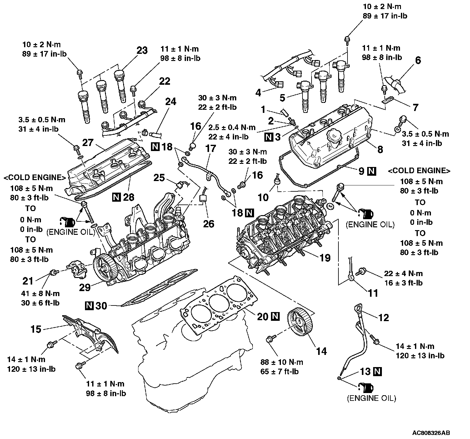 Tightening torque: 108 ± 5 Nm (80 ± 3 ft-lb) to 0 Nm (0 in-lb) to 108 ± 5 Nm (80 ± 3 ft-lb)