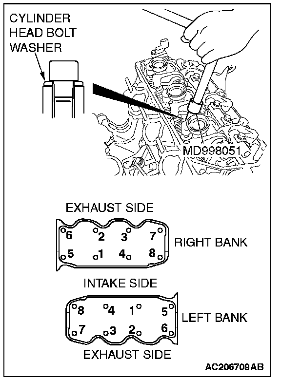 Use special tool MD998051 to loosen each bolt in two or three steps in the order shown in the illustration.