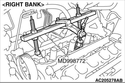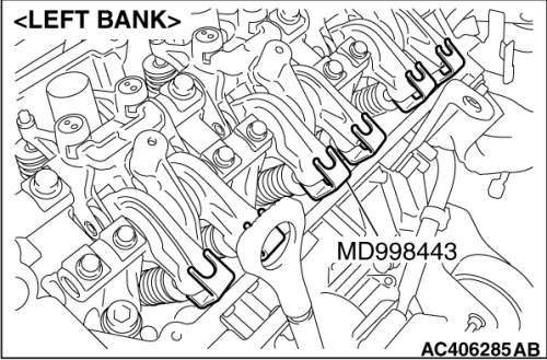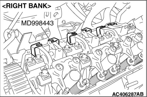 1. Install special tool MD998443 as shown in the illustration so that the lash adjusters will not fall out.
