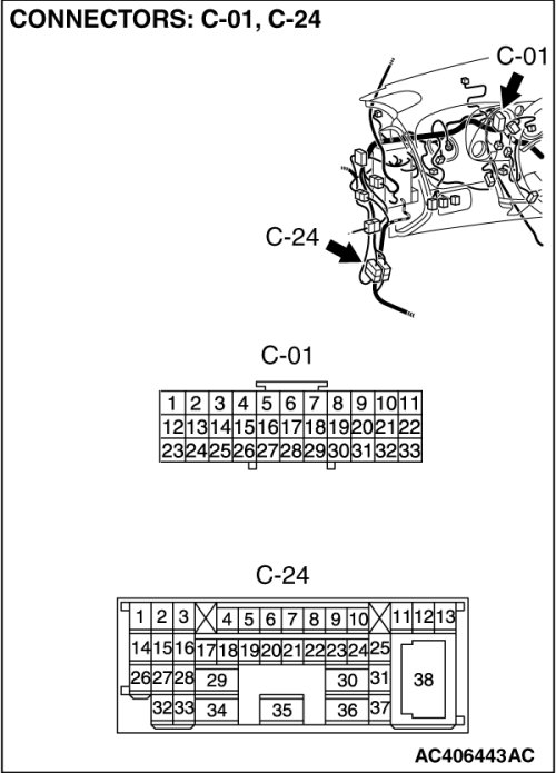 Also check intermediate connector C-24 and joint connector C-01 for loose, corroded, or damaged terminals, or terminals pushed back in the connector. If intermediate connector C-24 and joint connector C-01 is damaged, repair or replace the connector as described in Harness Connector Inspection Harness Connector Inspection.