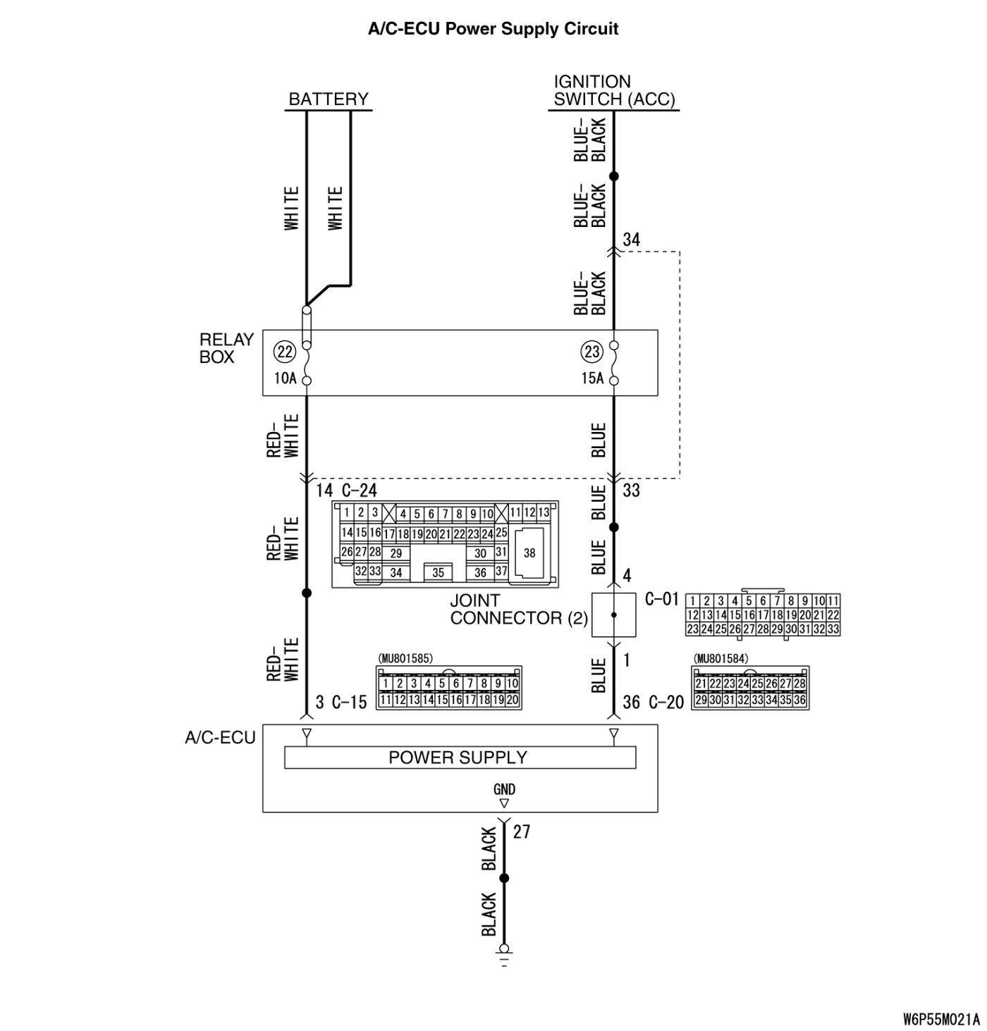 STEP 6. Check the wiring harness between A/C-ECU connector C-20 (terminal 36) and the ignition switch (ACC).