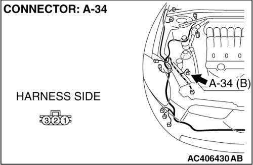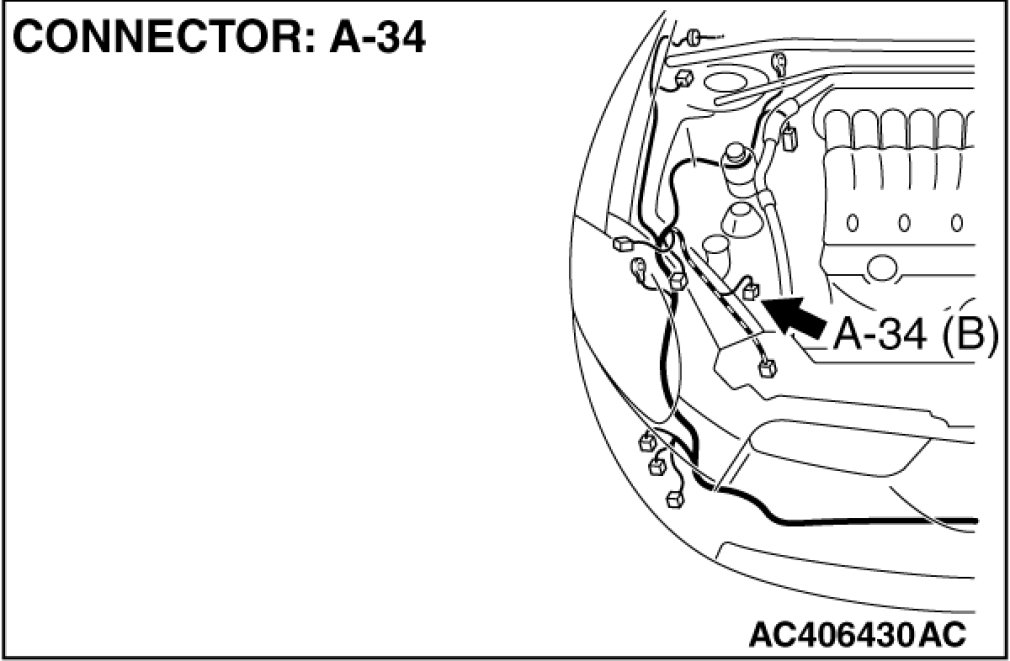 STEP 3. Check A/C pressure sensor connector A-34 for loose, corroded or damaged terminals, or terminals pushed back in the connector.