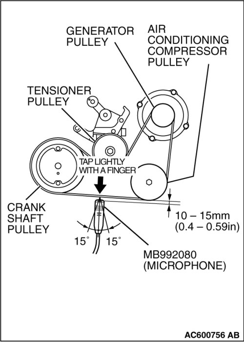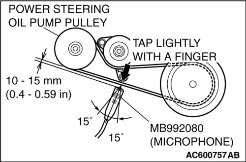 Hold special tool MB992080 to the middle of the drive belt between the pulleys (at the place indicated by arrow), approximately 10 - 15 mm (0.4 - 0.59 inch) away from the rear surface of the belt so that it is perpendicular to the belt (within an angle of ± 15 degree).