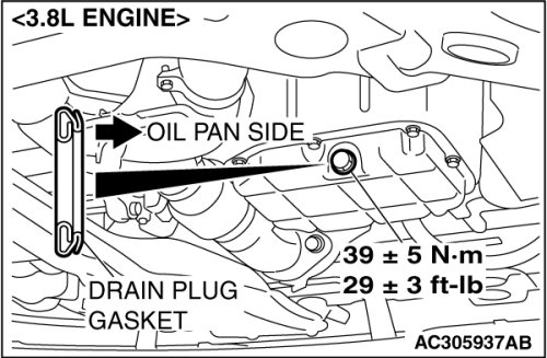 4. Install a new drain plug gasket so that it faces in the direction shown in the illustration, and then tighten the drain plug to the specified torque.