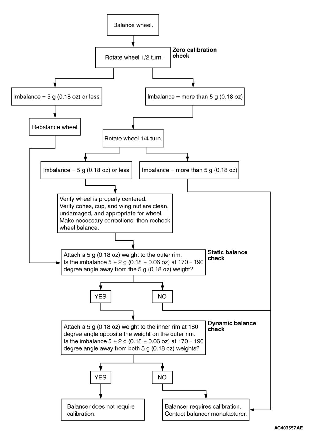 Check your balancer's calibration approximately every 100 balances. Your wheel balancer's instruction manual should include calibration procedures. If the calibration procedures specifically for your balancer are missing, use the generic steps in this section for zero calibration, static balance, and dynamic balance checks. The wheel balancer calibration checks are also described in the flowchart.
