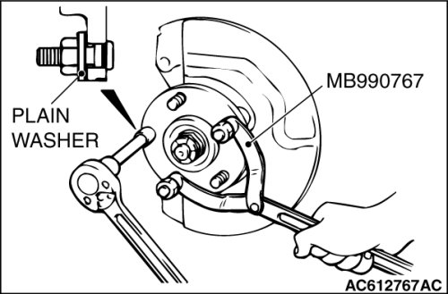 3. Install the plain washer to the new hub bolt, and install the bolt with a nut while holding the hub with special tool MB990767.