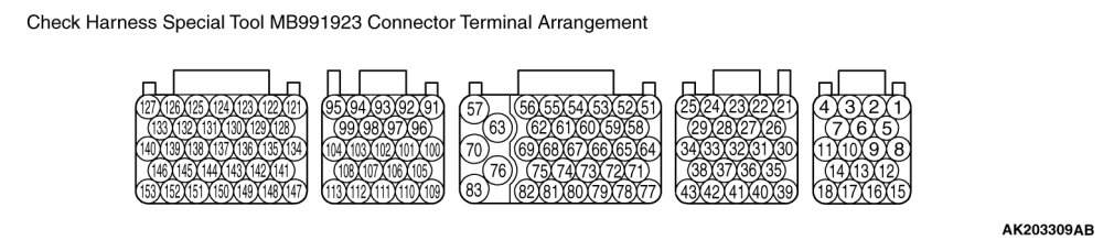 1. Disconnect the ECM [M/T] or the PCM [A/T] connectors B-19, B-20, B-21, B-22 and B-23, and connect check harness special tool MB991923 between the ECM [M/T] connectors or the PCM [A/T] connectors.