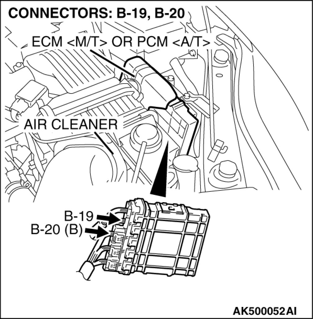 STEP 4. Check harness connector B-19 and B-20 at ECM [M/T] or PCM [A/T] for damage.