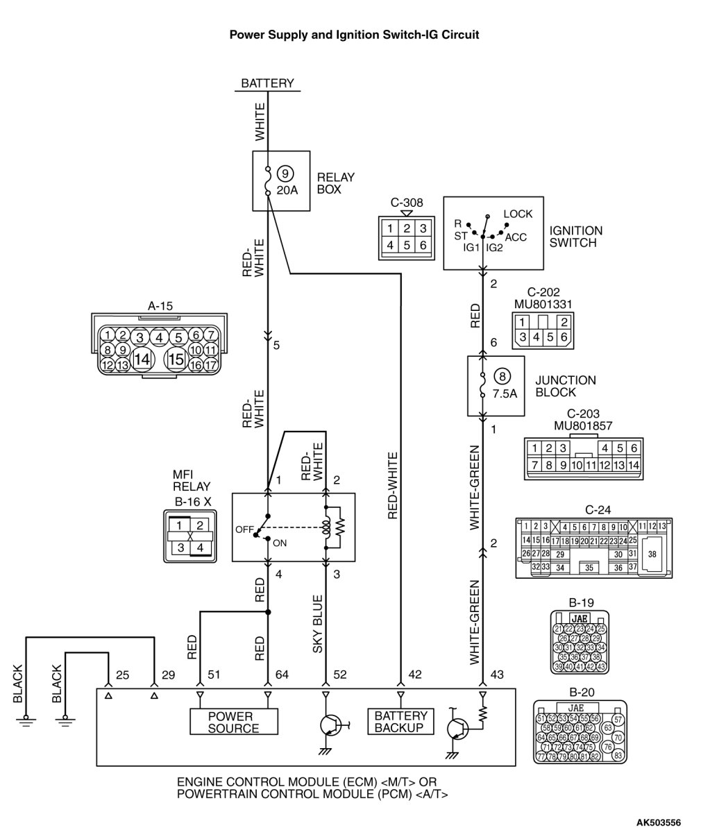 If intermediate connectors are in good condition, repair harness wire between ignition switch connector C-308 (terminal No. 2) and ECM [M/T] or PCM [A/T] connector B-20 (terminal No. 43) because of open circuit. Then confirm that the malfunction symptom is eliminated.